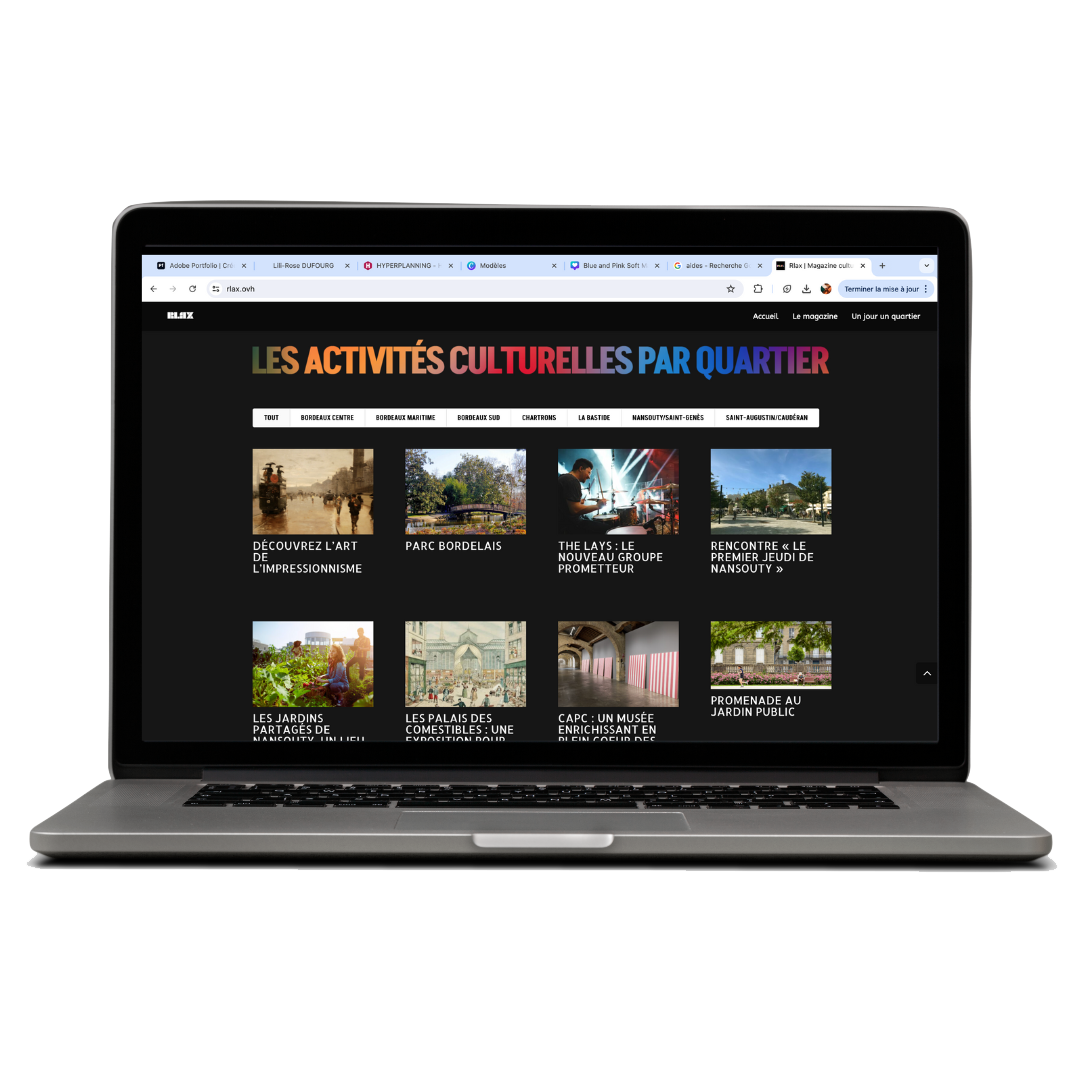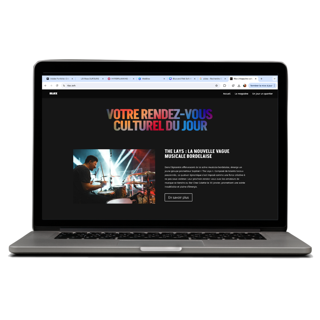 Rlax est un magazine culturel que nous avons imaginé dans le cadre d’un projet scolaire réalisé en groupe avec 3 autres  étudiants. L’idée était de concevoir un média mettant en avant la richesse culturelle de Bordeaux et de ses quartiers.